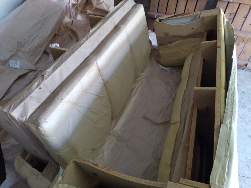 座面の革の張り替え、クッション追加を行うため、ソファを解体して作業します。