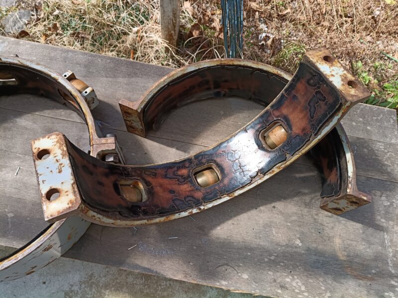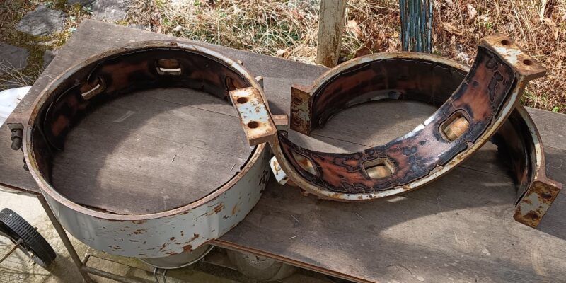 治具のボルトを外し、輪を半円の状態にして、劣化した革を剥がします。
